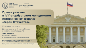 В период с 1 по 3 октября 2025 года в городе Санкт-Петербурге пройдет IV Петербургский молодежный исторический форум «Герои Отечества» по инициативе команды школьников и